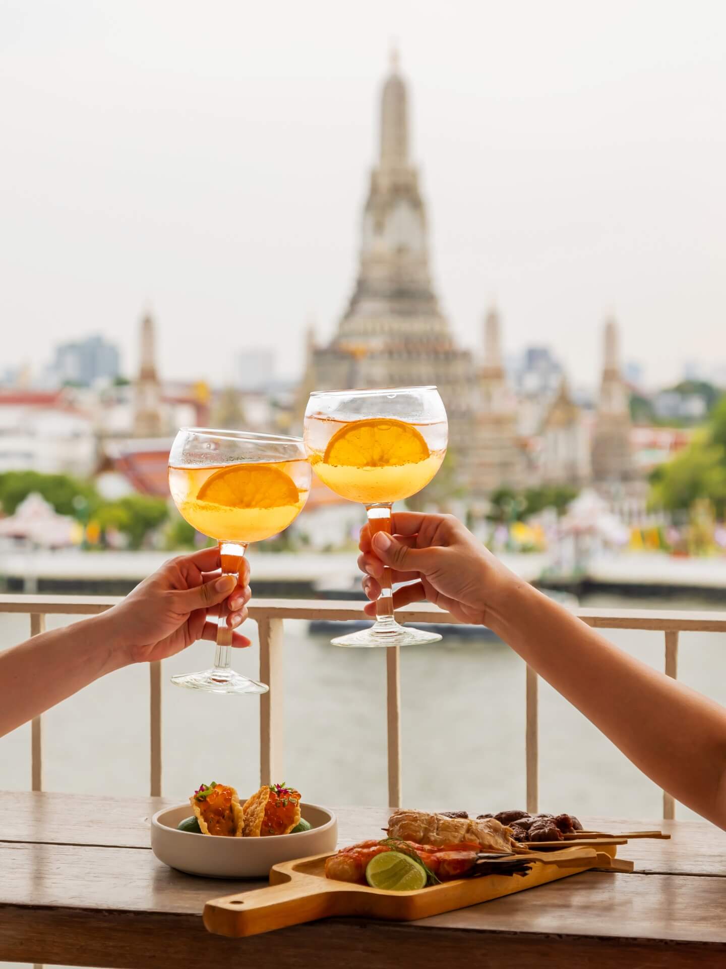 Al fresco cocktails and fresh oysters served on the fifth floor rooftop with panoramic sunset views of Wat Arun.